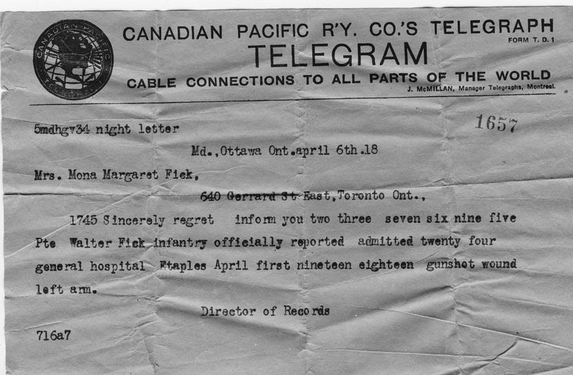 Telegram of his wounding, April 6, 1918.