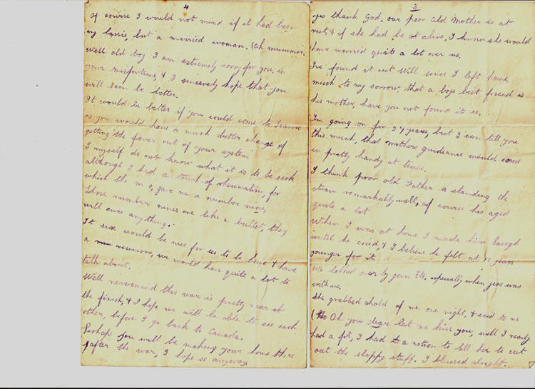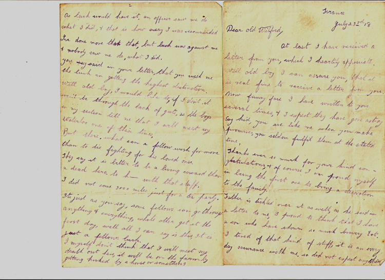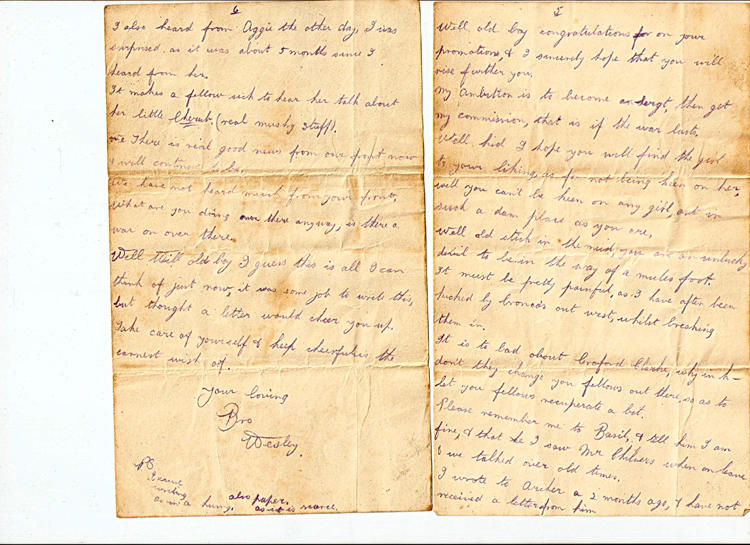 France July 23rd 18 Dear old Wilfred, At last I have received a letter from you, which I heartily appreciate. Well old boy I can assure you, that it is real fine to receive a letter from you. Now funny face I have written to you several times, & I expect they have gone astray. Say kid, you are like me when you make promises, you seldom fulfil them at the stated time. Thanks ever so much for your kind congratulations, & of course I am proud myself in being the first one to bring a decoration to the family. Father is tickled over it as well, as he said in a letter to me, & proud to think that I have a son who has shown so much bravery etc. I tired of that kind of stuff, it is an every day occurance with me, so did not expect anything. As luck would have it, an officer saw me do what I did & that is how I was recommended. I've done more than that, but luck was against me & nobody saw me do what I did. You said in your letter, that you wish the me luck in getting the highest distinction. Well old boy, I would like to, if I don't it won't be through the lack of guts, as the boys in my section tell me that I will meet my Waterloo one of these times. But there, what can a fellow wish for more than to die fighting for his loved ones. They say it is better to be a living coward than a dead hero, to h___ with that stuff. I did not come 3000 miles just for a tea party. Its just as you say, some fellows go through anything &everything, while others get it the first day, well all I can say is this, it is just a fellows luck. I myself don't think that I will meet my death out here, it will be on the farm by getting kicked by a mule or something. Yes, thank God, our poor old Mother is at rest, & if she had to be alive, I know she would have worried quite a lot over us. I've found it out Will since I left home, much to my sorrow, that a boys best friend is his mother, have you not found it so. I'm going on for 27 years, but I can tell you this much, that mother's guidance would come in pretty handy at times. I think poor old Father is standing the strain remarkably well, of course has aged quite a lot. When I was at home I made him laugh until he cried, I believe he felt at 10 years younger for it. We talked over by gones etc, especially when Jess was with us. She grabbed hold of me one night, & said to me Oh you dear let me kiss you, well I nearly had a fit, I had a notion to tell her to cut out the sloppy stuff. I blessed alright. Of course I would not mind if it had been my lassie, but a married woman. Oh mummer. Well old boy I am extremely sorry for you in your misfortune and I sincerely hope you will soon be better. It would be better if you could come to France as you would have a much better chance of getting the fever out of your system. I myself do not know what it is to be sick although I had a touch of rheumatism, for which the MO gave me a number nine. Those number nines are like a bullet, they will cure anything. It sure would be nice for us to be at home & have a reunion, we would have quite a lot to talk about. Well nevermind this war is pretty near at the finish, & I hope we will be able to see each other before I go back to Canada. Perhaps you will be making your home there after the war, I hope so anyway. Well old boy congratulations on your promotions, & I sincerely hope that you will rise further you. My ambition is to become a Sergt, then get my commission, that is if the war lasts. Well kid I hope you find the girl to your liking, as for not being keen on her, well you can't be keen on any girl, out in such a dam place as you are. Well old stick in the mud, you are an unlucky devil to be in the way of a mule's foot. It must be pretty painful, as I have been kicked by bronco's out west, whilst breaking them in. It is bad about Croford Clarke, why in h___ don't they change you fellows out there, so as to let you fellows recuperate a bit. Please remember me to Basil, & tell him I am fine, & that I saw Mr Chilvers when on leave & we talked over old times. I wrote to Archer 2 months ago, & have not received a letter from him. I also heard from Aggie the other day, I was surprised as it was about 5 months since I heard from her. It makes a fellow sick to hear her talk about her little Cherub (real mushy stuff). There is real good news from our front now & will continue to be. We have not heard much from your front. What are you doing over there anyway, is there a war on over there. Well Will old boy I guess this is all I can think of just now, it was some job to write this, but thought a letter would cheer you up. Take care of yourself & keep cheerful is the earnest wish of Your loving Bro Wesley Ps Excuse writing as in a hurry. Also paper as it is scarce.