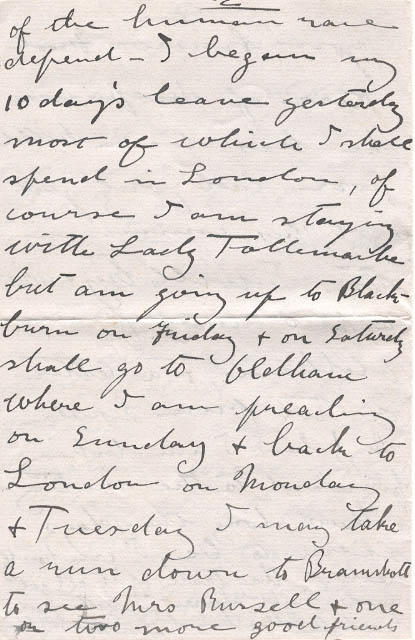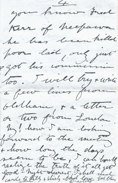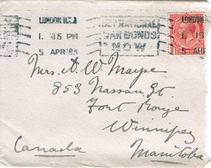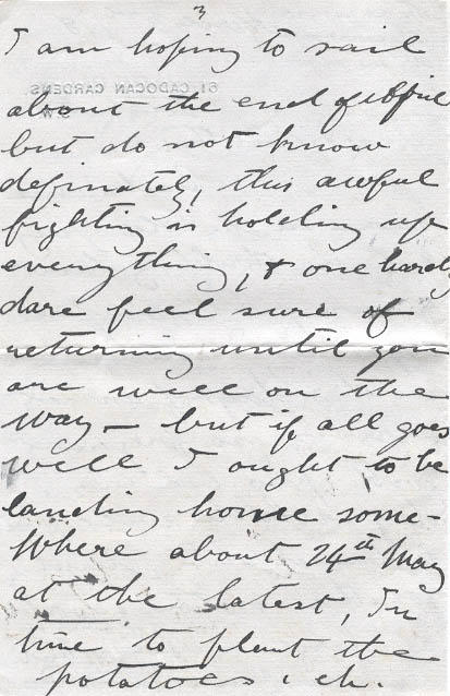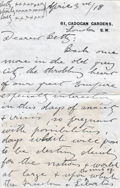 April 3rd/18 61 Cadogan Gardens, London S.W. Dearest Betty: Back once more in the old gray city, the throbbing heart of our great Empire especially interesting in this days of anxiety & crisis, so pregnant with possibilities, days which will prove to be destiny deciding for the nations & the world at large & upon which the Freedom & Liberties of the human race depend - I began my 10 days' leave yesterday most of which I shall spend in London, of course I am staying with Lady Tollemacke but am going up to Blackburn Friday & on Saturday shall go to Oldham where I am preaching on Sunday & back to London on Monday & Tuesday I may take a run down to Bramshot to see Mrs. Russell & one or two more good friends. I am hoping to sail about the end of April but do not know definitely in holding up everything, & one hardly dare feel sure of returning until you are well on the way - but if all goes well I ought to be landing home somewhere about 24th May at the latest. In time to plant the potatoes, eh. You know Fred Kerr of Neepawa he has been killed poor lad, only just got his commission too. I will try & write a few lines from Oldham, & a letter or two from London. My! how I am looking forward to the meeting & how long the days seem to be, I can hardly realize the truth of it all yet. Good-Night -dearest, I shall send cards to Billy & Shirley - fond love God bless D-addy