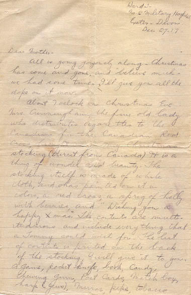About 7 oclock on Christmas Eve Mrs. Cunningham, the fine old lady who distributes cigarettes to the Canadians for the Canadian Red Cross brought me my Christmas stocking( direct from Canada) It is a thing of wonder and beauty. The stocking itself is made of white cloth, and has painted on it in colors, a red cross, a sprig of holly with berries and "Wishing you a happy Xmas." The contents are multitudinous and include everything that a Tommy could wish for. The list of contents is printed on the back of the stocking, I will give it to you. A game, pocket knife, book, Candy, chewing gum, Post Cards, Match boy harp (Jews), mirror, pipe, tobacco, writing pad, pencil, envelopes, soap, tooth paste, tooth brush, cigarettes, and hankerchief. Some list. The stocking was the admiration and envy of the whole ward. I have it hanging on the wall beside my bed, and it is examined and commented on several times a day. I would like to thank personally all the Canadian Red Cross Workers who made that stocking a possibility it sure is a peach.