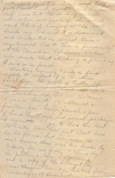 Christmas morning I woke to find myself the recipient of a Christmas parcel from the people of Exeter. Of course this parcel could not come up to the Canadian one, but all the same it was a beauty. It contained a fountain pen, knife, pencil, a pair of hand knitt sox, and several packages of cigarettes. I began to think then that old Santa Claus had just about done his bit for me- but no- when the mail arrived there were two books by O. Henry for me from I think by the postmark, Mrs. Schjelderuk and a copy of the Rubayat by Omar Khayam bound in leather from Cousin Aggy at Liverpool. I am uncertain as to who sent me the tow books by O. Henry as they merely contain inscriptions wishing me a merry Christmas, and a small note stating that the donor was busy but a letter would follow. However the post mark has I think given her away and I will give the little woman a lecture when I write her.