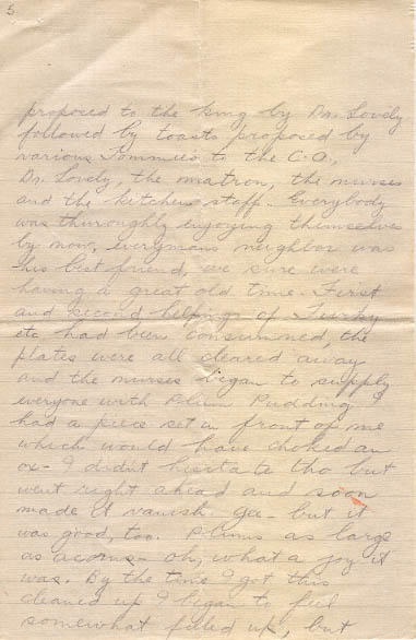 Soon I found I was facing a dish load with slices of breast, stuffing, potatoes, turnips, cabbage and lot of gravy. I did not hesitate a moment but dug right in and found the dinner more than jake. It was a marvel. While we earnestly intent on the Turkey, nurses carrying huge pitchers full of beer and lemonade rapidly filled our glasses with our choice of Beverage. While the Turkey was being consummed a toast was proposed to the king by Dr. Lovely followed by toasts proposed by various Tommie's to the C.O., Dr. Lovely, the matro, the nurses and the kitchen staff. Everybody was thoroughly enjoying themselves by now, everymans neighbor was his best friend, we sure were having a great old time. First and second helpings of Turky etc. had been consummed, the plates were all cleared away and the nurses began to supply everyone with Plum Pudding had a piece set in front of me which would have choked an ox. I didn't hesitate tho but went right ahead and soon made it vanish. Gee, but it was good, too. Plums as large as acorns, oh, what a joy it was. By the time I got this cleaned up I began to feel somewhat filled up, but to find space for some candy and more lemonade.