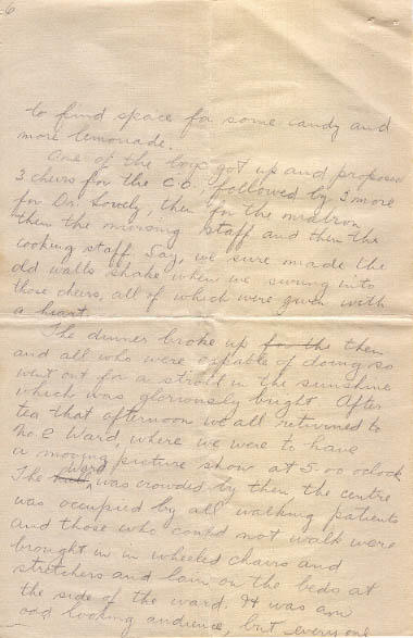 One of the boys got up and proposed 3 cheers for the C.O, followed by 3 more for Dr.Lovely, then for the matron then the nursing staff and then the cooking staff. Say, we sure made the old walls shake when we swung into those cheers, all of which were given with a heart.