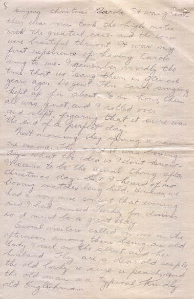 Several visitors called on me in the afternoon among them being an old lady I met on the street and her husband. They are a dear old couple, the old lady is sure a peach and the old man is a typical kindly old Englishman.