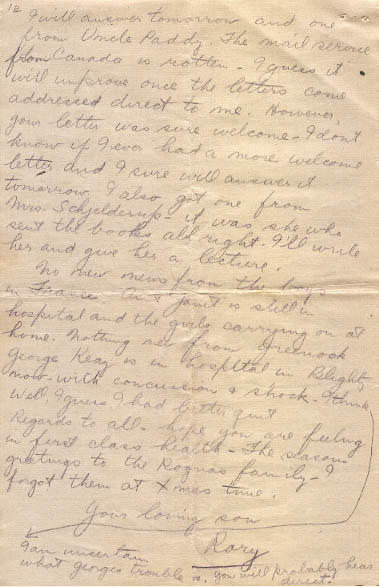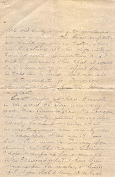 Today has been quiet, but I had mince Turkey for dinner, all the same home. I hope it keeps up for a month. Also I received what I have been longing for for weeks, a letter from you dated Nov.13 which I will answer tomorrow and one from Uncle Paddy. The mail service from Canada is rotten. I guess it will improve once the letters come addressed direct to me. However, you letter was sure welcome. I don't know if I ever had a more welcome letter and I sure will answer it tomorrow. I also got one from Mrs. Schjelderup- it was she who sent the books all right. Ill write her and giver her a lecture.