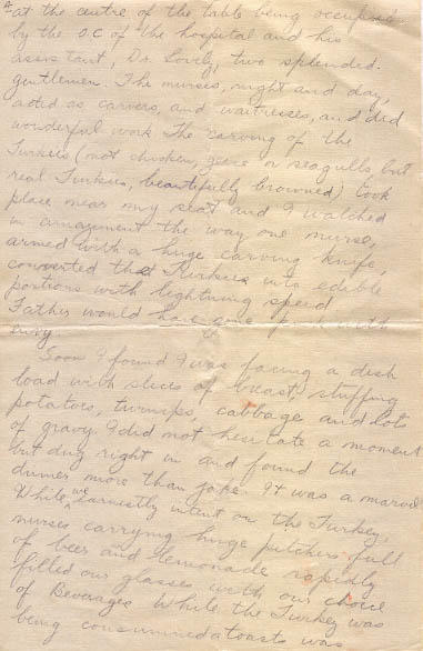 Christmas morning passed without great event, we were all too busy going over our gifts to be interested in much else. At noon came the most important event of the day. Christmas Dinner. A long table, constructed out of numerous small tables, had been laid for the feast in Ward 2, which is nearly 150' long. The table extendid from one end of the ward to the other, patients were seated around it as closely as they could be seated, the seats of honor at the centre of the table being occupied by the O.C of the hospital and his assistant, Dr.Lovely, two splendid gentlemen. The nurses, night and day, acted as carvers, and waitresses, and did wonderful work. The carving of the Turkies (not chicken, geese or seagulls, but real Turkies, beautifully browned) took place near my seat and I watched in amazement the way one nurse, armed with a huge carving knife, converted that Turkies into edible portions with lightining speed. Father would have gone pink with envy.