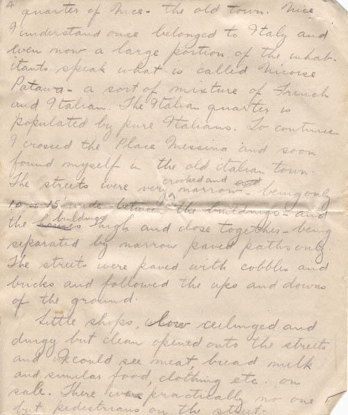 I will give you another chapter in the history of my visit to Nice etc. When I left off last letter, I was on the point of going to visit the Italian quarter of Nice- the old town. Nice I understand once belonged to Italy and even now a large portion of the inhabitants speak what is called Nicoise Pataua- a sort of mixture of French and Italian. The Italian quarter is populated by pure Italians. To continue I crossed the Place Messina and soon found myself in the old italian town. The streets were very crooked and narrow- being only 10 or 15' wide between the buildings - and the buildings high and close together- being separated by narrow paved paths only. The streets were paved with cobbles and bricks followed the ups and downs of the ground.
