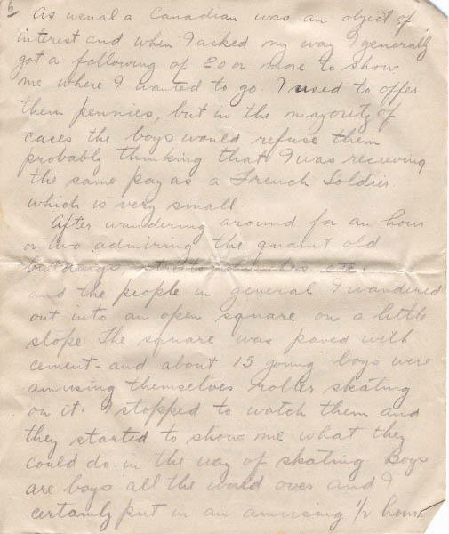 As usual a Canadian was an object of interest and when I asked my way generally got a following of 20 or more to show me where I wanted to go. I used to offer them pennies, but in the majority of cases the boys would refuse them probably thinking that I was recieving the same pay as a French Soldier which is very small.
