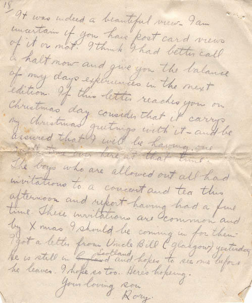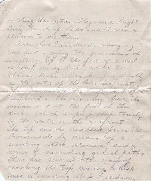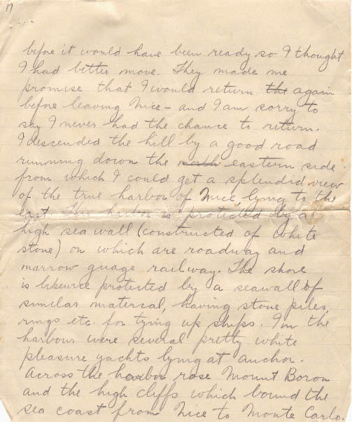 I decided that I had better get moving as I wanted to see more of the town before the day finished so I bid the kindly couple goodbye and started off. They were very anxious for me to stay for supper but considerable time would have elapsed before it would have been ready so I thought I had better move. They made me promise that I would return again before leaving Nice- and I am sorry to say I never had the chance to return. I descended the hill by the good road running down the eastern side from which I could get a splendid view of the true harbor of Nice lying to the east. This harbor is protected by a high sea wall (constructed of white stone) on which are roadway and narrow guage railway. The shore is likewise protected by a seawall of similar material, having stone piles, rings etc. for tying up ships. In the harbour were several pretty white pleasure yachts lying at anchor. Across the harbor rose Mount Boron and the high cliffs which bound the sea coast from Nice to Monte Carlo. It was indeed a beautiful view. I am uncertain if you have post card views of it or not. I think I have better call a halt now and give you the balance of my days experiences in the next edition. If this letter reaches you on Christmas day consider that it carrys my Christmas greetings with it- and be assured that I will be having one swell time over here at that time. The boys who are allowed out all had invitations to a concert and tea this afternoon and report having had a fine time. These invitations are common and by Xmas I should be coming on for them- I got a letter from Uncle Bill (Glasgow) yesterday. He is still in Scotland and hopes to see me before he leaves. I hope so too. Here's hoping.