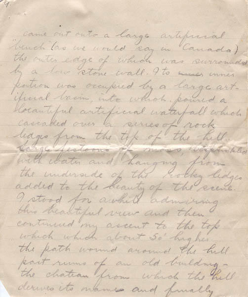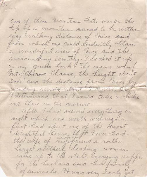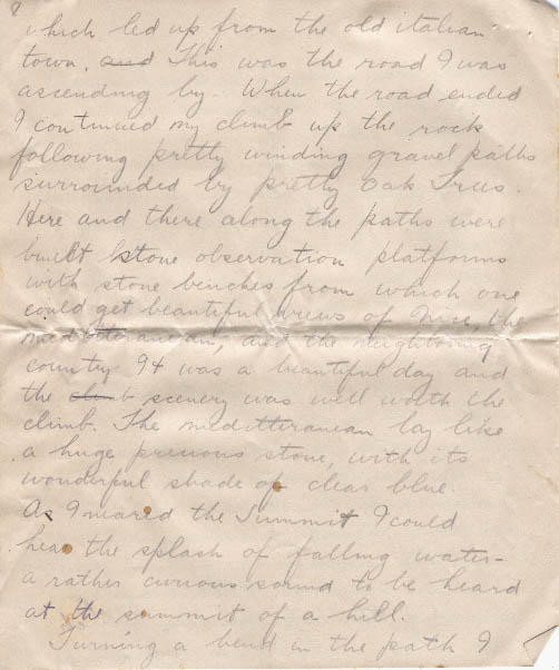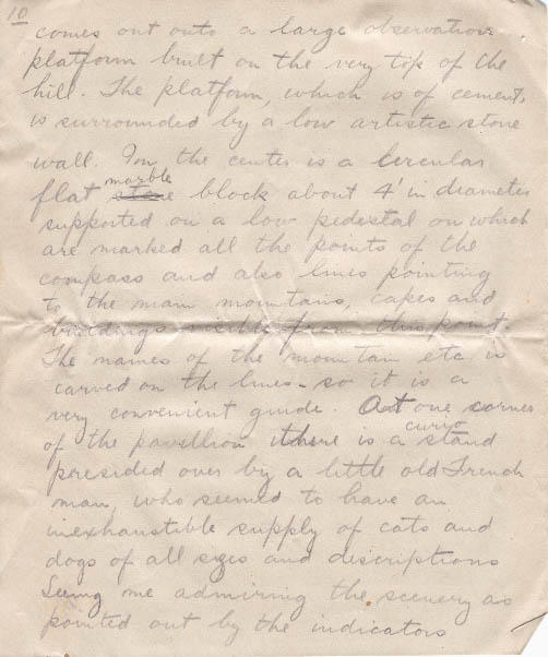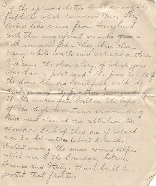 Turning a bend in the path I came out onto a large artificial "bench" (as we would say in Canada) to the outer edge of which was surrounded by a low stone wall. Its inner portion was occupied by a large artificial basin, into which poured a beautiful artificial waterfall which cascaded over a series of rock ledges from the top of the hill. Large festoons of moss, besprinkled with water and hanging from the underside of the rocky ledges added the beauty of the scene. I stood for awhile admiring this beautiful view and then continued my ascent to the top which which about 50' higher the path wound around the hill past the ruins of an old building- the chateau from which the derives its names and finally comes out outs a large observation platform built on the very top of the hill. The platform, which is of cement is surrounded by a low artistic stone wall. In the center is a circular flat marble block about 4' in diameter supported on a low pedestal on which are marked all the points of the compass and also lines pointing to the main mountains, capes and buildings visible from this point. The names of the mountains etc. is carved on the lines- so it is a very convenient guide. Out one curves of the pavilion there is a curio stand presided over by a little old French man, who seemed to have an inexhaustible supply of cats and dogs of all sizes and descriptions. Seeing me admiring the scenery as pointed out by the indicators he came over and in French started in to give me a more detailed description of what lay before us. I could understand what he said and thuroughly appreciated his kindness. He excused himself after a few moments talk and going to his booth returned carrying a large telescope supported on a tripod, which he "set up" in front of me. He then fixed the telescope on various objects within view whose distance from us varied from 1 to 50 miles after which I would look thru the telescope and admire the views selected while he told me the various points of interest connected with it. I spent a most delightful hour in this manner- I saw a Russian Church, a post card of which I have sent you, and the colors of the various glasses of which the dome is constructed were truly wonderful. The he fixed the glass on several of the splendid hotels built among the foothills which surrounded Nice. The looked like scenes from Fairyland with their magnificent grounds with numerous palm trees, their clean creamy white walls and artistic outlines. Next came the observatory, of which you also have a post card. The pure white of the dome blended beautifully with the dark green of the pine trees surrounding it. The various forts built on the tops of the high mountains surrounding Nice next claimed our attention. He showed me 5 or 6 of these one of which was 80 kilometers (about 50 miles) distant among snow covered Alpes which mark the boundary between France and Italy. It was built to protect that frontier. One of these Mountain Forts was on the top of a mountain seemed to be within easy walking distance of Nice- and from which one could evidently obtain a wonderful view of Nice and the surrounding country. I looked it up in my guide book the name was Mt. Chauve, the height about 3000' and the distance from Nice by winding roads about 8 miles. So I determined that I would take a hike out there on the morrow.
