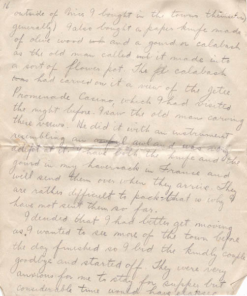 After I had viewed everything in sight which was worth viewing- in fact had spent one of the most delightful hours that I ever had- the wife of my newfound friend- a rather large motherly looking woman came up to the stall carrying supper for the husband and his family of animals. I was very early yet but the cooking had to be done on a stove in the stall. I went over to select some post cards from a large collection which they had on view and while there she very kindly gave me a liberal handful of fresh ripe figs (say they were good) and a cup of coffee which the french always seem to have on hand. While trying to keep up a conversation with her in mixed French and English I noticed that she often used German words, so I asked her if she could speak German. At first she evaded the question but latter admitted that she could- that her parents had sent her to Germany to have her education completed. She requested me not to make any mention of it to the French people as they would probably think that she was a spy. I told her where I had learnt my German at which she expressed Great surprise. From then one our conversation when easily I found that I could converse pretty fine with her and she had no trouble understanding my efforts. She went on to tell me how her husband loved animals- which was very evident- as he must have had at least 10 dogs of various sizes and colors and 10 cats of the same category. She showed me the comfortable sleeping quarters that he had built for them around his stall. The two of them had evidently seen better days as she told me he had had a horse but had sold it - likewise an auto since the war started. I suppose then stock did not sell fast now that the tourist trade had fallen off. After exhausting our subjects of conversation, I bought a lot of post cards- (which I hope you have received by now) showing various views in Nice- (The ones of towns outside of Nice I bought in the towns themselves generally). I also bought a paper knife make of olive wood and a gourd or calabash as the old man called it made into a sort of flower pot. The calabash had carved on it a view of the Jetee Promenade casino, which I had visited the night before. I saw the old man carving these views. He did it with an instrument resembling an awl and was very adept at it. I have both the knife and the gourd in my haversack in France and will send them over when they arrive. They are rather difficult to pack- that is why I have not sent them so far.