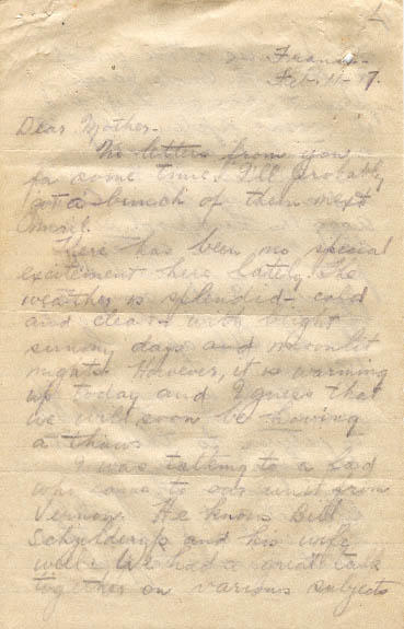 There has been no special excitement here lately. The weather is splendid- cold and clear- with bright sunny days and moonlit nights. However, it is warming up today and I guess that we will even be having a thaw.