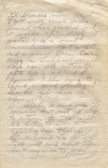 I was talking to a lad who came to our unit from Vernon. He knows Bill Schyelderyk and his wife well. We had a great talk together on various subjects. The primitive stove which I got with Uncle Jack's present has arrived and it works spendidly. It certainly is a great convenience. Got a letter and a parcel from Cousin Aggy in Liverpool several days ago. She certainly puts up a splendid parcel. I am going to find a good husband for her apres le guerre.