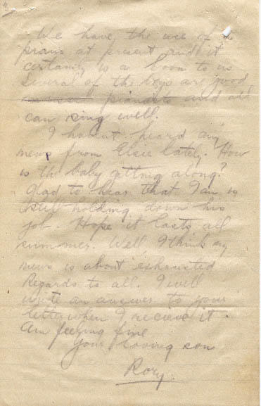 Blake is now over the measles but not yet able to return to the unit. We hope to see him again soon though. Blendel and Lee still look well and send their best regards to you. We have the use of a piano at present and it certainly is a boom to us. Several of the boys are good pianists and all can sing well.