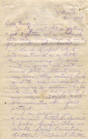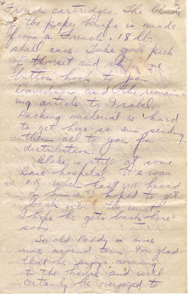 I am sending you 2 souvenir buttonhooks and 1 paper knife. They are made from Canadian buttons. Imperial button French cartridges. The blade of the paper knife is made from a French .18lb shell case. Take your pick of the set and ship one button hook to Jean Davidson and the remaining article to Isabel. Packing material is hard to get here so am sending them all to you for distribution.