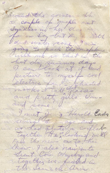 I met … Harold Eads several … ago and we had quite a conflab together. He is looking well. Pass the news on to his Maw. I also ran into Trent Cole Winslry and together we fished in the Saanick Arm and hunted deer over the Sooke Hills. He seen a pretty fine so… man, but evidently has his worries. He asked me to mention that I had seen him.