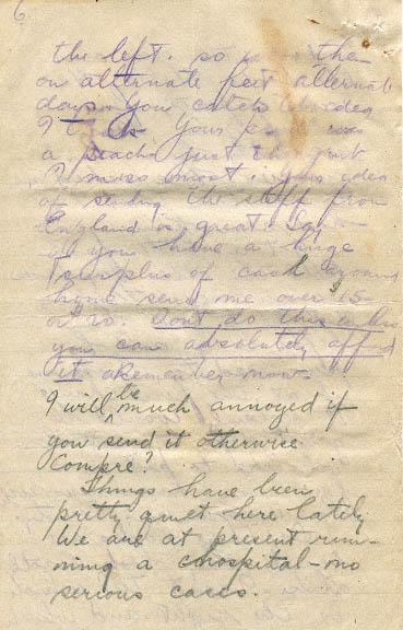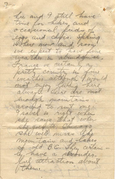 Things have been pretty quiet here lately. We are at present running a hospital- no serious cases. Lee and I still have time for hikes and occasional feeds of eggs and chips. Spring is here now and soon we expect to have fine weather in abundance. France is certainly a pretty country in fine weather although I would not enjoy living here always. There are not enough mountains around to sent me. Isabel is right when she says that when she says that when she goes to Chicago she will miss the mountains and lakes of old B.C. They certainly have a wonderful attraction about them.