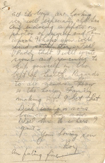 All the boys are looking very well especially old Sea Ants enclosing a photo on photo's of myself and him which I hope you will find satisfactory. Tell Paddy that I will write soon! and remember to keep yourself in the best of health. Regards to all hands. How is the Lovejoy Family making out. I bet that Dick is some bouncing boy now. Well this is where I quit.