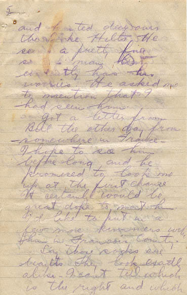 Got a letter from Bill the other day from somewhere in France. I hope to see him before long and he promised to look me up at the first chance. It certainly would be great dope to meet him. I'd like to put in a few more summers with him in Francois Country.