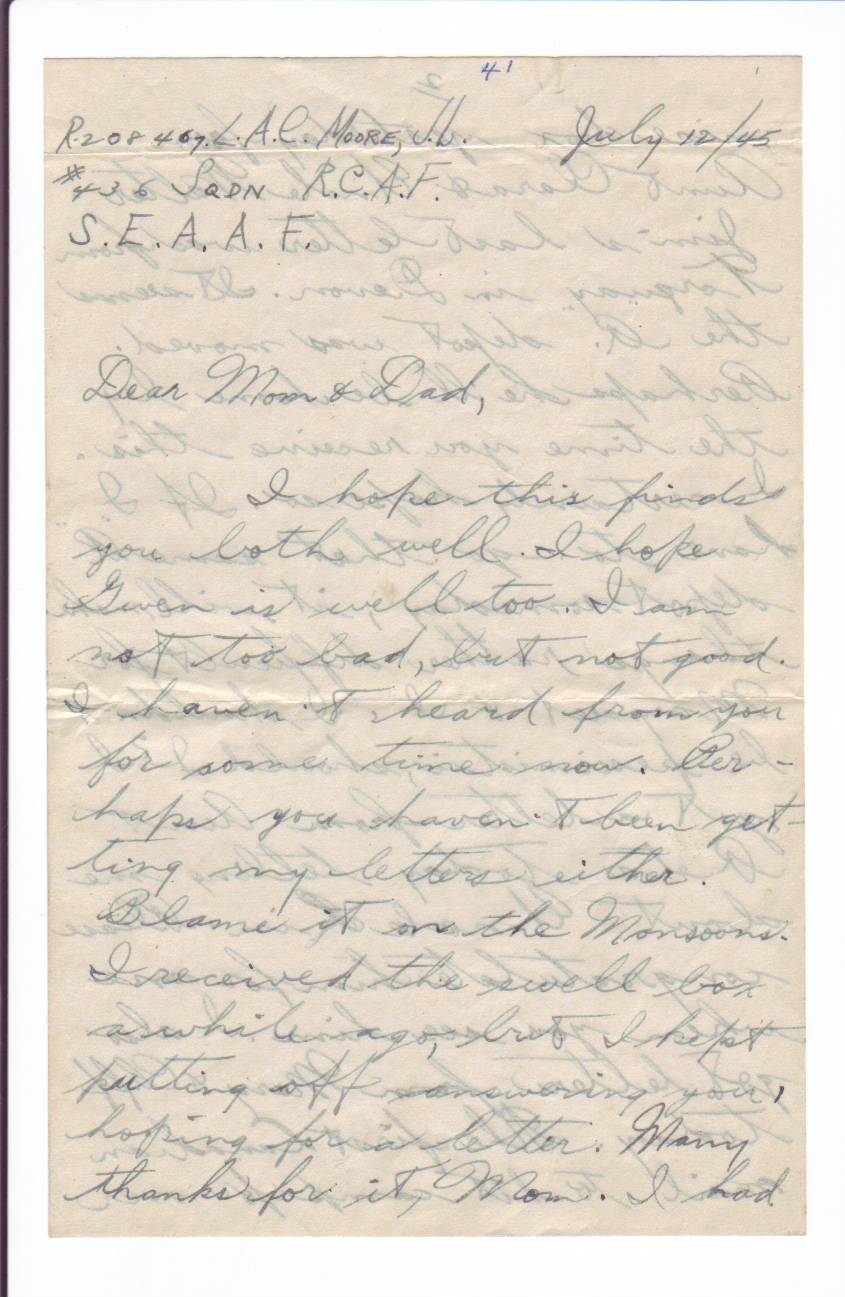 I hope this finds you both well. I hope Gwen is well too. I am not too bad, but not good. I haven't heard from you for some time now. Perhaps you haven't been getting my letters either. Blame it on the Monsoons. I received the swell box a while ago, but I kept putting off answering you hoping for a letter. Many thanks for it, Mom. I had a nice box yesterday from Aunt Clara and Uncle Walter. Jim's last letter was from Torquay in Devon. It seems the "R." depot was moved. Perhaps he'll be home by the time you receive this. I certainly hope so. If I have to go to that same "R" depot someday, it will make things rather difficult for Margaret & I. I shouldn't be so pessimistic, should I? I got a letter from Aunt Reta today telling me about Uncle Lin. Please congratulate him for me when you see him. I also got letters from Mary and Cliff today. The first Canadian mail to hit the camp for over a week, by the way. Today was the first sunny day we've had for a while, too. Everybody madly attacked their laundry. With these continual rains everything is mouldy & rotting. Even the tent. Laugh if you like but I think my brain is even mouldy. The feeling one gets out here is very hard to describe. I also got a letter from Sandy MacDonald, my roommate in Galt. He is in Bournemouth now, "Over at last," he says. I guess he'll be joining the occupational forces. I wish I were in that part of the world, instead of this deadly place. I surely don't envy those boys going to the South Pacific. They don't know what they're letting themselves in for. By the way, is there anything promising developing around home regarding jobs, etc. It well help a great deal when the great day of returning home comes, if I know a little about what's going on, and how the old town has changed. I'm enclosing a couple of clippings I ran across. I'll have to go now. So long & thanks again for the box.