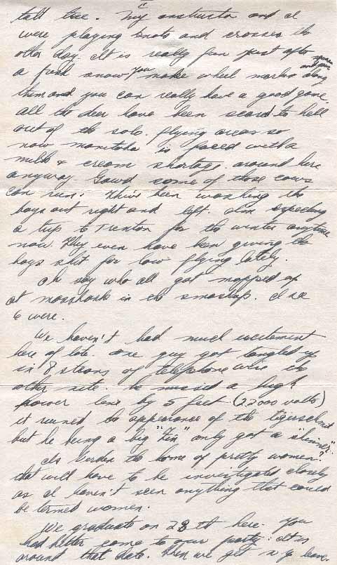 We haven't had much excitement here of late. One guy got tangled up in 8 strings of telephone wire the other nite he missed the flight tower by 5 feet (27000 volts) it ruined the appearance of the [?] but he being a big "Zin" only got a "slimmer".