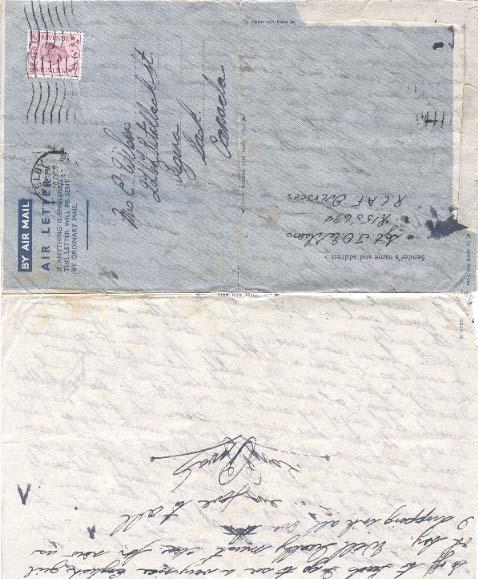 Sometimes I am really getting behind on my letter writing and yet I write a letter of two a night. I really don't know what I would like for Xmas except maybe shirts & socks. There is really nothing else I need or that I can think of at present but usually anything in the way of clothes or eats would suit me fine. I am going to start to write letters pretty soon as my airmail letters are running a little low so don't worry if you don't hear from me for awhile as it takes a little longer for them to go. I might be able to get a few more after a while but I don't know. I really haven't got much to write about this time but I won't tell any of my secrets in my letter to Dad or Delbert so I may have some more news in them. I do know one thing thought that I am going to put on my winter [?] to-night because it really sis bloody cold over here and I can't seem to keep warm at all. I am practically sitting on top of the stove and I am still freezing slowly but surely. I have really been having a very quiet time since I came here, mostly because of he money situation but it will improve to-morrow as it is pay-day so off to Leeds I go to see a very nice English girl oh boy. Well I really must close for now as I dripping ink all