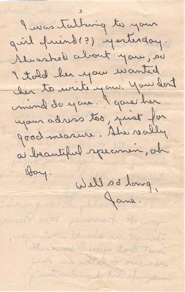 I was talking to your girl friend (?) yesterday. She asked about you, so I told her you wanted her to write you. You don't mind do you. I have her your address too, just for good measure. She really a beautiful specimen, oh boy.