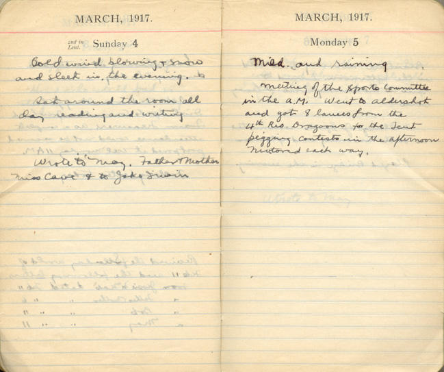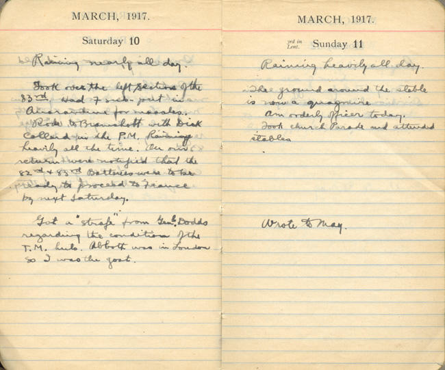 Took over the left Sections of the 83rd. Had 7 sick - put in Quarantine for measles. Rode to Bramshott with Dick Collard in the P.M. Raining heavily all the time. On our return were notified that the 82nd and 83rd Batteries were to be ready to proceed to France by next Saturday.