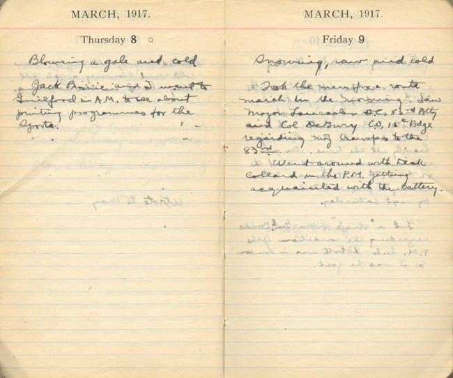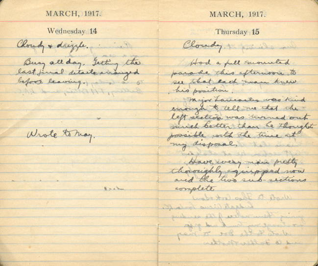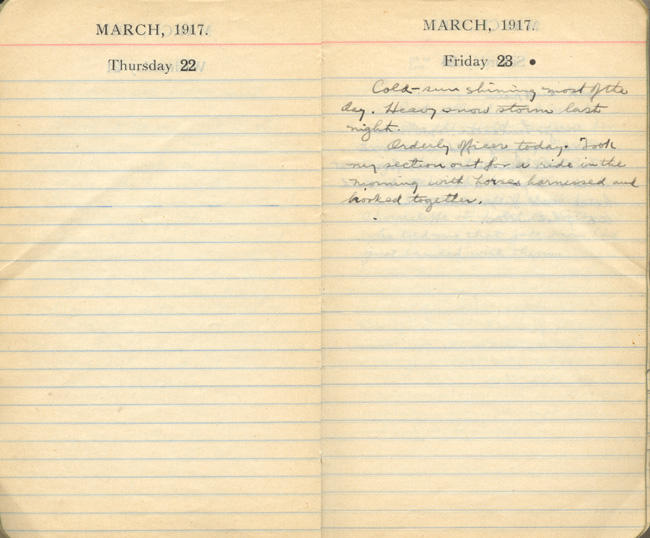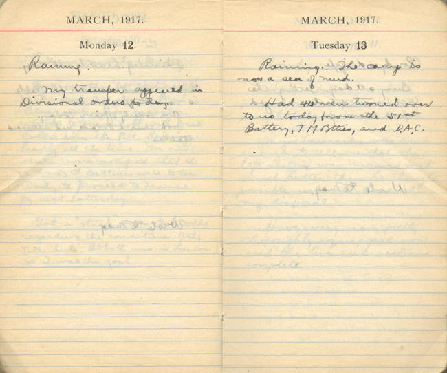 Did not disentrain as expected last night. Arrived at St. Pol about 2 P.M. and were met by Ivan McStory who announced to us that our battery was to be broken up and given to other batteries of the 2nd division C.F.A. Disentrained at Brias. Hooked in and marched to Grand [?] a distance of 20 miles. Arrived there at 3 A.M. and each section was directed to the Battery it was to reinforce. The left section went to the 22nd Battery, the centre to the 21st and the Right to the 23rd.