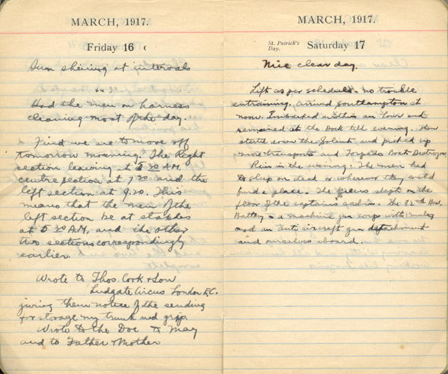 Left as per schedule - no trouble entraining. Arrived Southampton at noon. Imbarked within an hour and remained at the Dock till evening. Then started down the Solent and picked up more transports and Torpedo Boat, Destroyer.