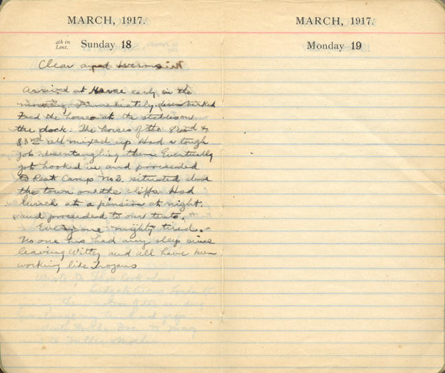 Arrived at Havre early in the morning. Immediately disembarked. Feed the horses at the stables on the dock. The horses of the 82nd & 83rd all mixed up. Had a tough job disentangling them. Eventually got hooked in and proceeded to Rest Camp No 2 situated above the town on the cliffs. Had lunch at a pension at night. and proceeded to our tents.