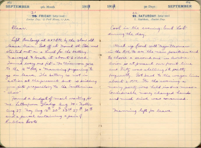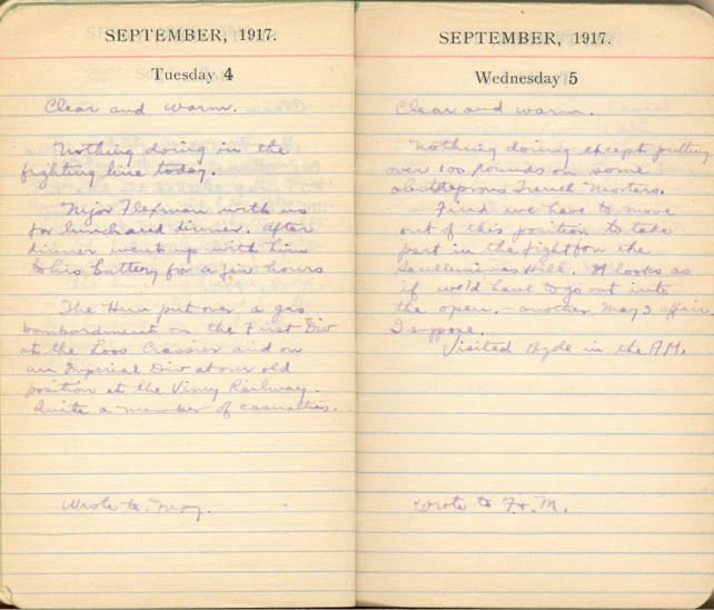 Went up front with Major Flexman in the AM to see the new position and to choose a second one in Avion. Avion is at present our front line and Fritz was shelling it pretty frequently. Got back to the wagon lines about 2 PM. In the evening a merry party was held in our mess - Considerable money changed hands and much drink was consumed.