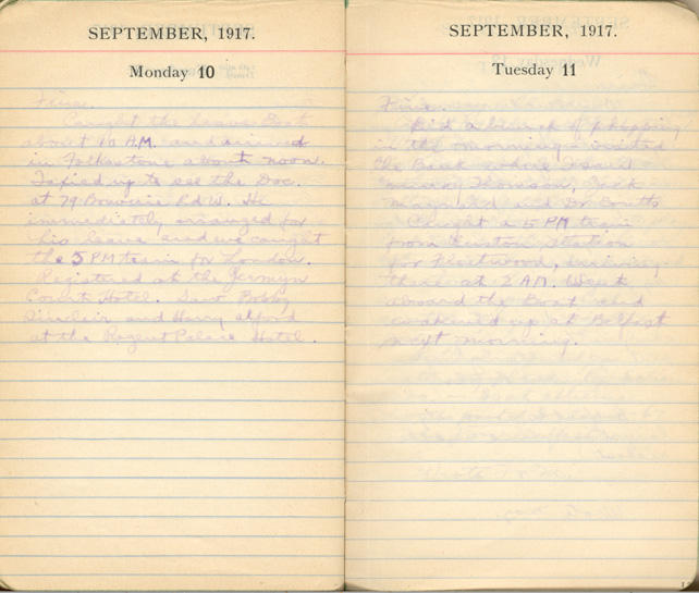 Caught the Leave Boat about 10 A.M. and arrived in Folkestone about noon. Taxied up to see the Doc. at 79 [?] Rd W. He immediately arranged for his leave and we caught the 3 P.M. train for London. Registered at the Jermyn Court Hotel. Saw Bobby Sinclair and Harry Alford at the Regent Palace Hotel.
