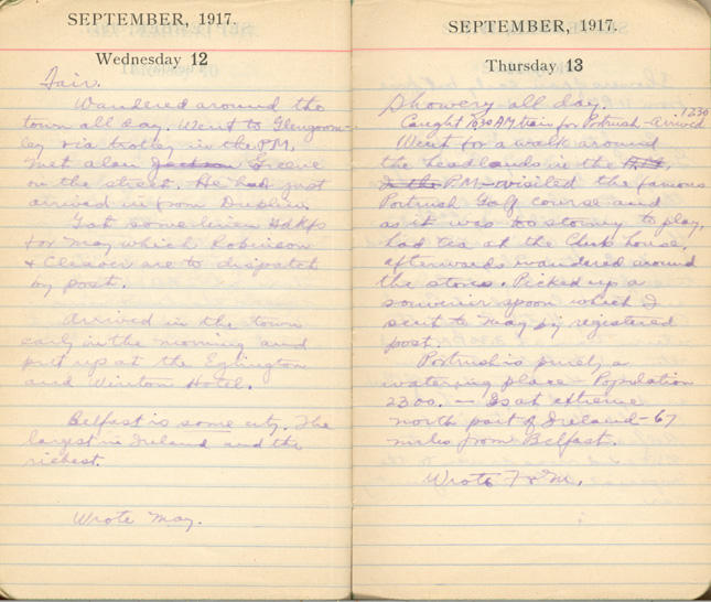 Wandered around the town all day. Went to [?] via trolley in the P.M. Met Alan Greene on the street. He had just arrived in from Dublin.