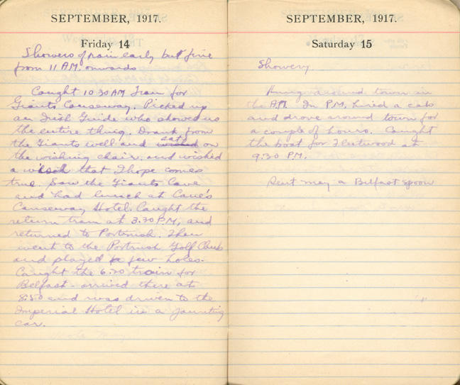 Caught 10.30 AM Train for Grants Causeway. Picked up an Irish Guide who showed us the entire thing. Drank from the Giants well and sat on the wishing chair and wished a wish that I hope comes true. Saw the Giants Cave and had lunch at Cave's Causeway Hotel. Caught the return train at 3.30 P.M, and returned to Portrush. Then went to the Portrush Golf Club and played a few holes. Caught the 6.20 train for Belfast - arrived there at 8.50 and was driven to the Imperial Hotel in a jaunting car.