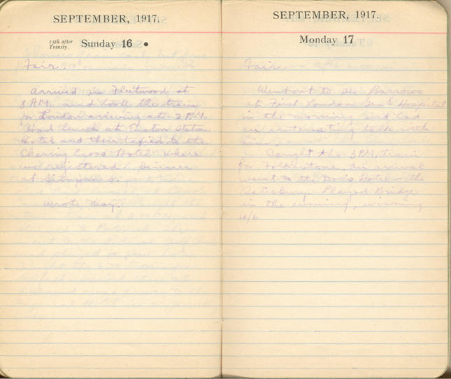 Arrived in Fleetwood at 8 A.M. and took the train for London arriving at 2 P.M. Had lunch at Euston Station Hotel and then taxied to the Charing Cross Hotel where we registered. Dinner at Simpsons.
