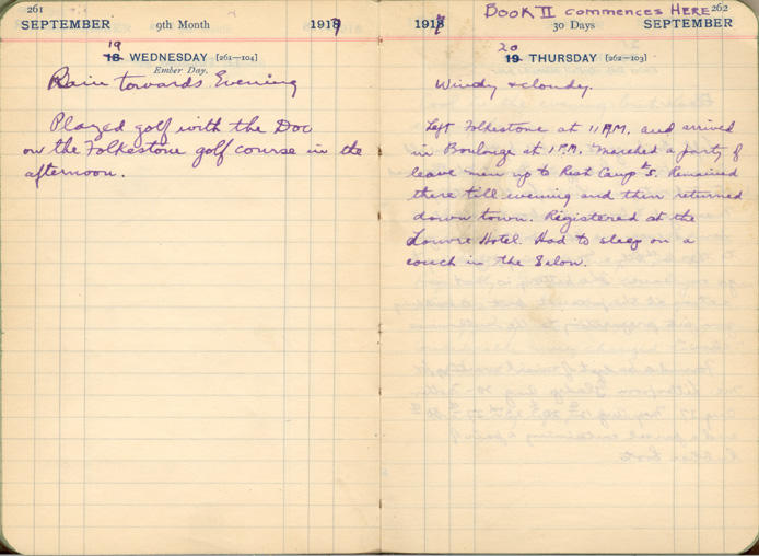 Left Folkstone at 11 a.m., and arrived in Boulogne at 1 p.m. Marched with party of [?] now up to Rest Camp # 5. Required there until evening and then returned down town. Registered at the Louvre Hotel. Had to stay on a couch in the Salon.