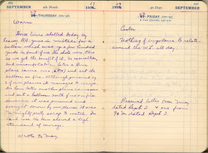House lives shelled today by heavy A.A. guns in mistake for a balloon which was up a few hundred yards in front of us The shots were plus 20 we got the benefit of it. No casualties, but uncomfortable. Later a Hun plane came over (6 PM) and set the balloon on fire. Although pursued by 2 of our planes it managed to escape. An hour later another plane came over and set a balloon North of us on fire. However it was pursued and brought down by our planes, it was a mighty pretty scrap to watch. In each case the Hun showed a high standard of courage.