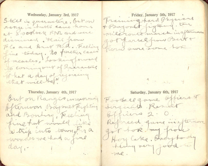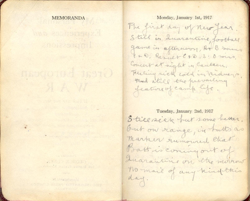 The first day of New Year. Still in Quarantine, football game in afternoon, At Biorns C + D. Renuer C + D - 3 O wins. Concert at night in Canteen. Feeling sick cold in kidneys. Mud still the prevailing feature of camp life.