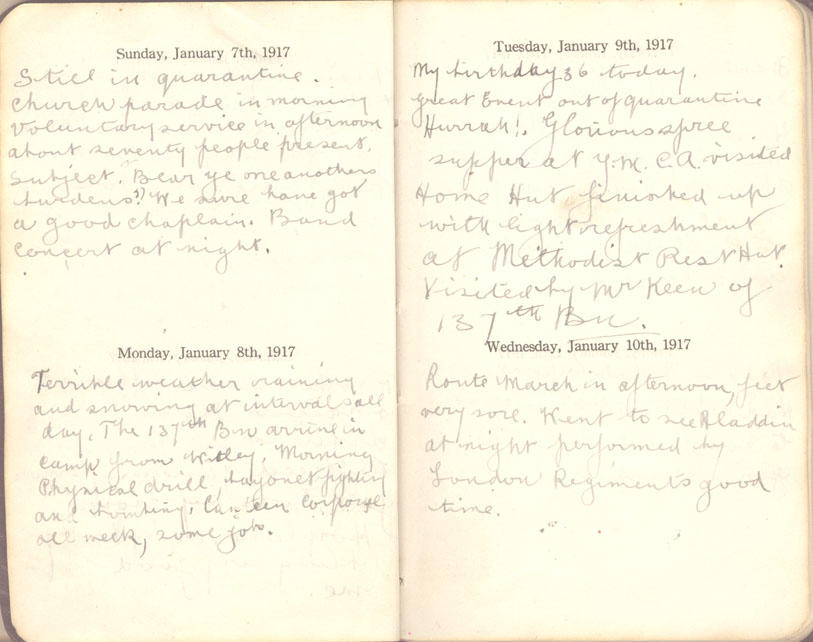 Terrible weather raining and snowing at intervals all day. The 137th Bn arrive in camp from Witley. Morning Physical drill, bayonet fighting and bombing, Canteen corporal all week, some job.