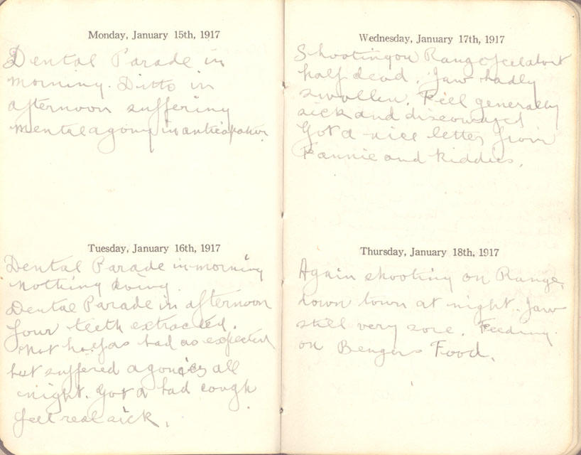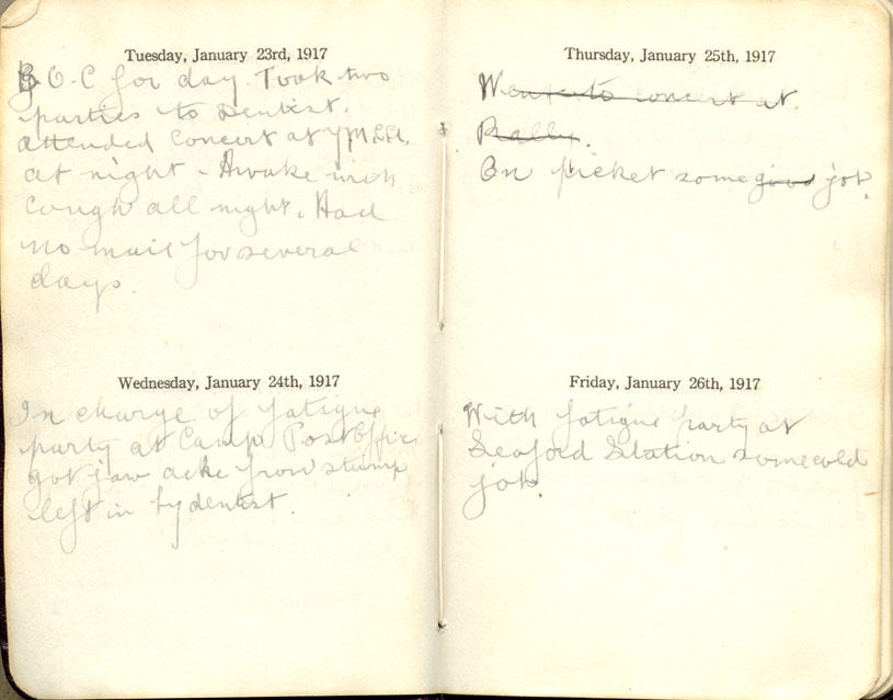 In charge of fatigue party at Camp Post Office got jaw ache from stump left in by dentist.