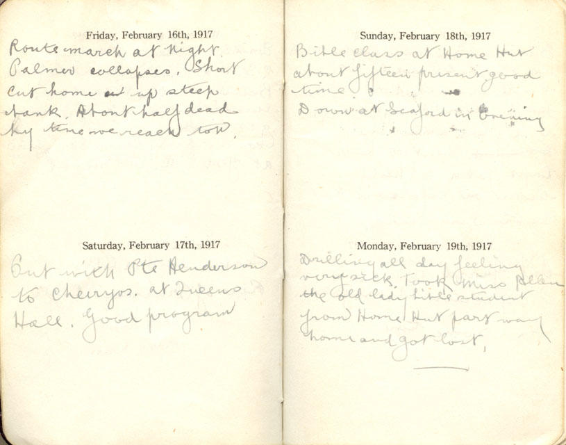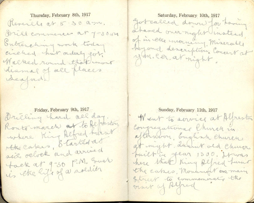 Drilling hard all day. Route march to Alfreston where King Alfred burnt the cakes, Started at six oclock and arrived back at 9-30 P.M. Such is the life of a soldier