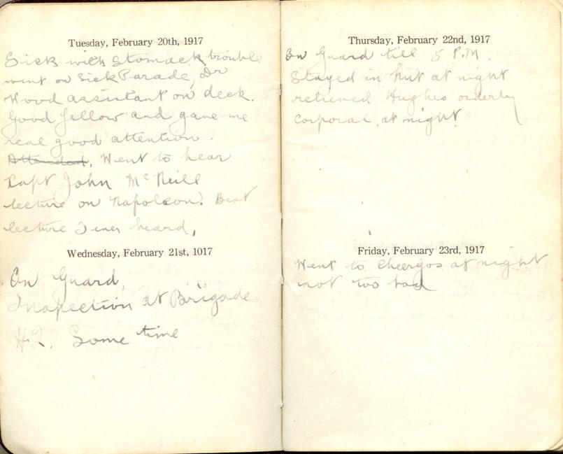 Sick with stomach trouble went on Sick Parade, Dr Wood assistant on deck. Good fellow and gave me real good attention. Went to hear Capt John McNeill lecture on Napoleon. Best lecture I ever heard.