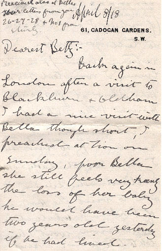 Back again in London after a visit to Blackburn & Oldham[?] I had a nice visit with Bella though short, I preached at Zion on Sunday, poor Bella she still feels very keenly the loss of her baby he would have been two years old yesterday if he had lived. she goes every Sunday to take flowers to the little grave, I went with her yesterday & I could not help but think of that morning at St Peters, when we though our own darling Billy was drifting out from us, you can well imagine what a heart - break it is to see the empty cot, the empty carriage etc., last Thursday I visited Hampton Court Palace