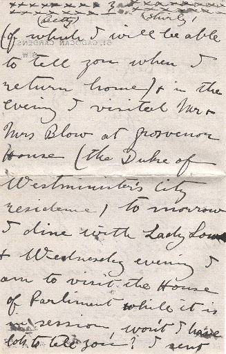 of( which I will be able to tell you when I return home) & in the evening I visited Mr & Mrs Blow at Grosvenor House (the Duke of Westminister's City residence) to morrow I dine with Lady Low & Wednesday evening I am to visit the House of Parliament while it is in session won't I have lots to tell you? I sent