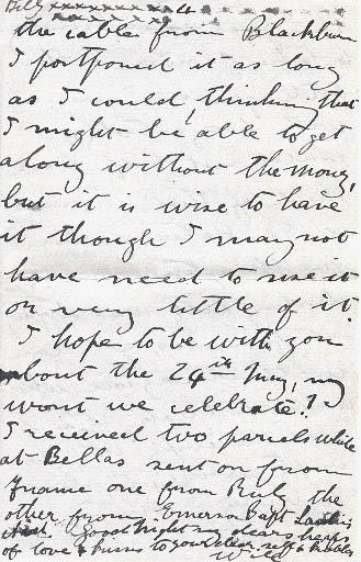 I hope to be with you about the 24th May, my wont we celebrate? I received two parcels while at Bellas sent on from France one from Billy[?] the other from Emerson Baft[?] Ladies which Good Night my dears heaps of love & kisses to your dear self & kiddies