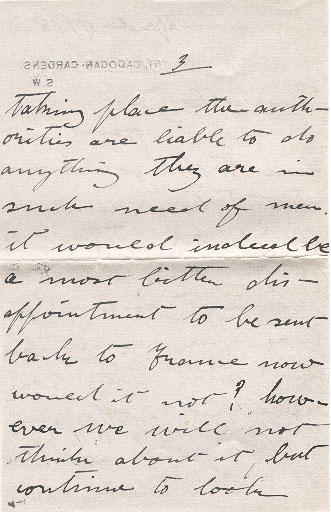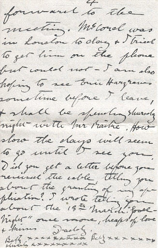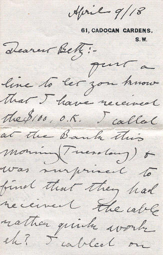 Just a line to let you know that I have received the $100, O.K. I call at the Bank this morning (Tuesday) & was surprised to find that they had received the cable rather quick work eh? I cabled on Saturday from Blackburn. I met Lady Low this evening she was here to dinner we had a very pleasant time, shall be retuning to Shorncliffe on Friday & hope in a couple of weeks to be starting out for Canada, I shall not feel easy until I am safely on the way - for with all this terrible fighting taking place the authorities are liable to do anything they are in such need of men it would indeed be a most bitter disappointement to be sent back to France now would it not? however we will not think about it, but continue to look forward to the meeting. McCoral[?] was in London today & I tried to get him on the phone but could not - I am also hoping to see Eric Hargraves sometimes before I leave, & shall be spending Thursday night with Mr Bailne[?]. How slow the days will seem to go until I see you. Did you get a letter before you receive the cable, telling you about the granting of my application? I wrote telling you about the 13th March "Fool[?] Night" once more, heaps of love & kisses