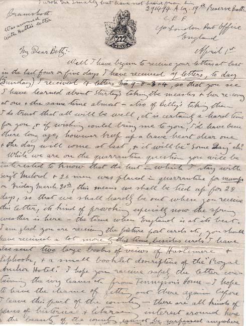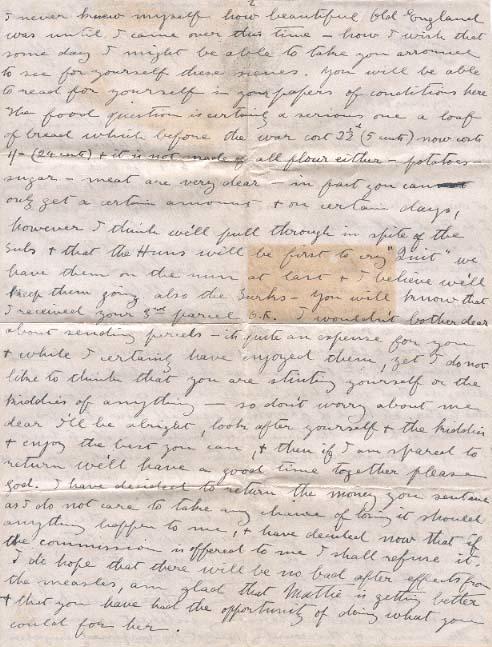 While we are on the quarantine question you will be interested to know that the hut in which I stay with Serg't McLord & 26 men was placed in quarantine for mumps on Friday March 30th, this means we shall be tied up for 28 days, so that we shall hardly be out when you receive this letter, its kind of provoking especially now the spring weather is here - the time when England is at its best. I am glad you are receiving the picture post cards etc, you should have received a lot more by this time, besides cards I have also sent two large books of views of Haslemere & Lipbook, & a small booklet descriptive of the "Royal Anchor Hotel." I hope you receive safely the letter containing the ivy leaves etc from Tennyson's Home - I hope to have the chance of getting out there again before I leave this part of the country - there are all kinds of places of historical & literary interest around here & the beauty of the country cannot be surpassed anywhere I never knew myself how beautiful Old England was until I came over this time - how I wish that some day I might be able to take you arround to see for yourself these scenes. You will be able to read for yourself in your papers of conditions here. The food question is certainly a serious one a loaf of bread which before the war cost 2 ½ (5 cents) now costs [?]= (24 cents) & it is not made of all flour either - potatoes - sugar - meat are very dear - in fact you can only get a certain amount & on certain days, however I think we'll pull through in spite of the subs & that the Huns will be the first to cry "Quit" we have them on the run at last & I believe we'll keep them going also the Turks - You will know that I received your 3rd parcel O.K. I wouldn't bother dear about sending parcels - its quite an expense for you & while I certainly have enjoyed them, yet I do not like to think that you are stinting yourself of the kiddies of anything - so don't worry about me dear I'll be alright, look after yourself & the kiddies & enjoy the best you can, & then if I am spared to return we'll have a good time together please God. I have decided to return the money you sent me as I do not care to take any chance of losing it should anything happen to me, & have decided now that if the commission is offered to me I shall refuse it. I do hope that there will be no bad after effects from the measles, am glad that Mattie is getting better & that you have had the opportunity of doing what you could for her.