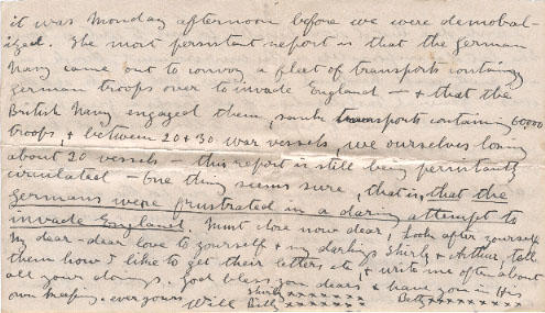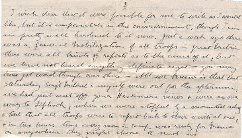 I wish dear that if were possible for me to write as I would like, but it is impossible in this environment, though I am pretty well hardened to it now. Just a week ago there was a General Mobilization of all troops in Great Britain there were all kinds of reports as to the cause of it, but we have not heard anything definite as yet - you may have got word though over there - All we know is that last Saturday Serg't McLord & myself were out for the afternoon, we had just sent off your Haslemere views & were on our way to Lipbook, when we were stopped by a mounted order & told that all troops were to report back to their units at once, & in two hours time every man in Camp was ready for France or anywhere they might choose to send us it was Monday afternoon before we were demobilized. The most persistent report is that the German Navy came out to convoy a fleet of transports containing German troops over to invade England - & that the British Navy engaged them, sank transports containing 6000 troops, & between 20 & 30 war vessels, we ourselves loosing about 20 vessels - this report is still being persistently circulated - One thing seems sure, that is, that the Germans were frustrated on a daring attempt to invade England. Must close now dear, Look after yourself My dear - dear love to yourself & my darlings Shirley & Arthur, tell them how I like to get their letters etc, & write me often about all your doings. God bless you dears & have you in His own keeping. Ever yours