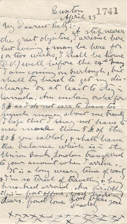 A step nearer the great objective, I arrived here last evening & may be here for 1 or two weeks, I shall be home(D.V.) well before the 24th of May. I am coming on Furlough but shall try hard to get my discharge or at least to stay in Canada. Am enclosing order for 3£ as I do not care to leave too much money about me traveling. I hope that I may not have to use more than 5£ of the 20£ you cabled, & shall have the balance which is in the Union Bank, London transferred to your account when I arrive.